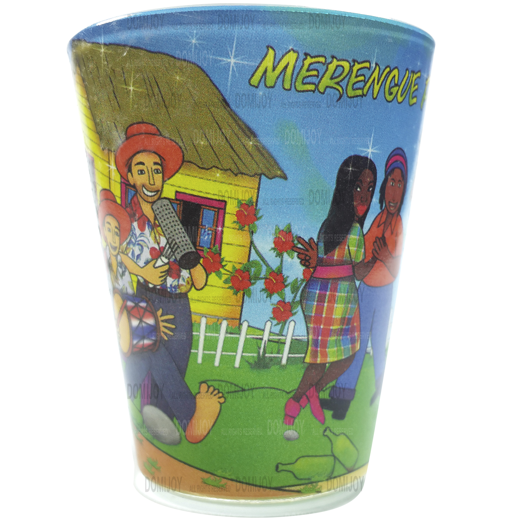 - Small-wide shot glasses with typical and colorful designs of Dominican Republic (in this case among other symbolic images, you can see people dancing with the rhythm of our national music; merengue).