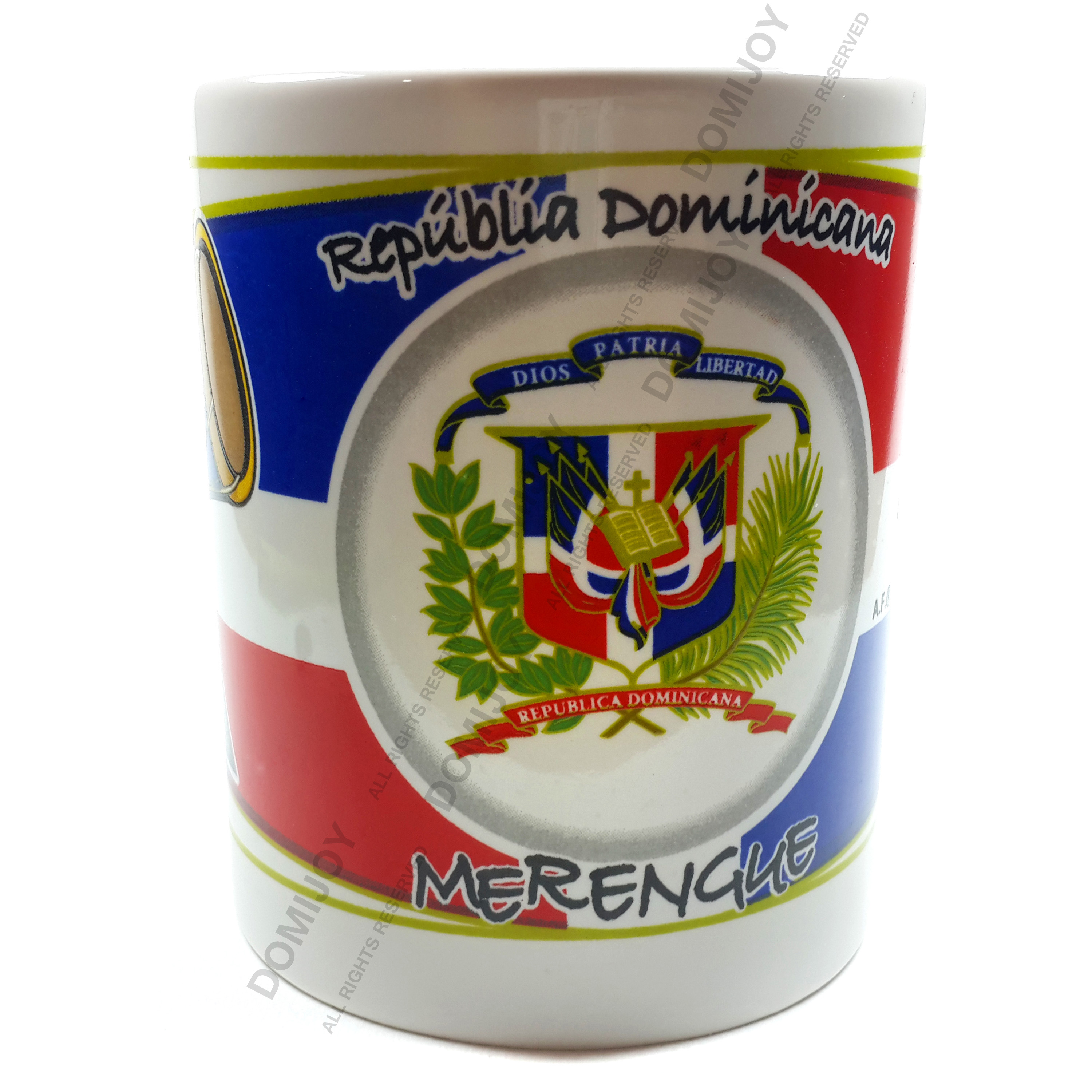 - Mug with typical designs of Dominican Republic (in this case among other symbolic images, you can see the instruments used to play the national music rythm; merengue).