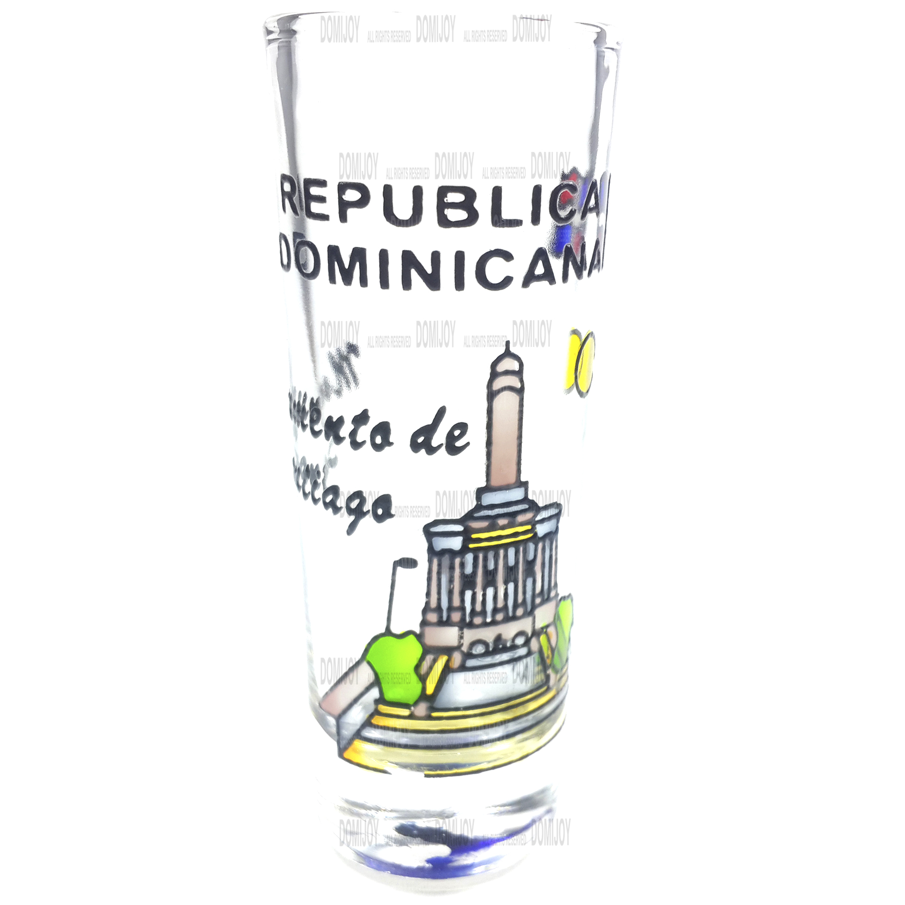 • Large-Thin shot glasses with typical and colorful designs of Dominican Republic (in this case among other symbolic images, you can see “El Monumento a los Heroes de la Restauracion” in Santiago, Dominican Republic).